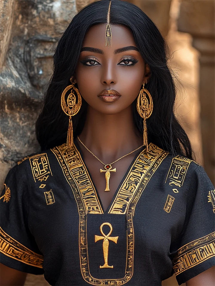 Ankh Ancient Egyptian Golden Embroidered Linen Tunic