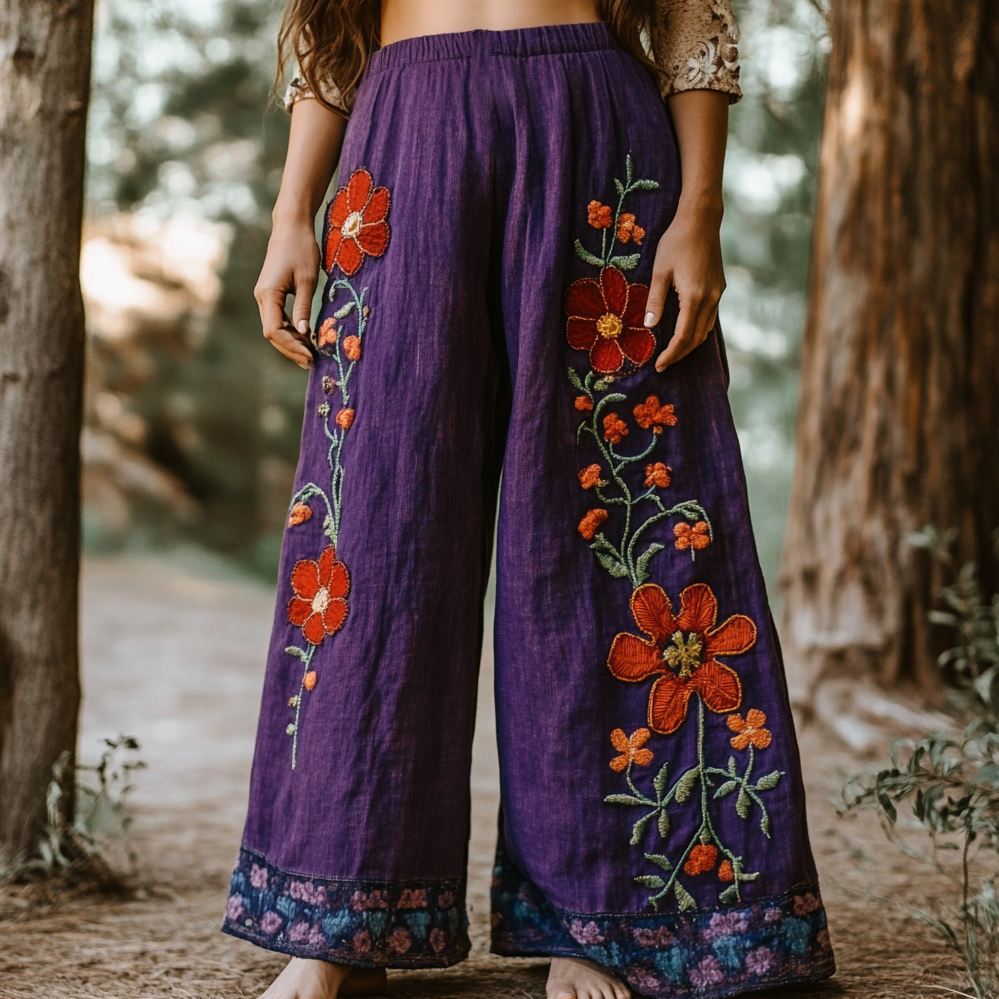 Bohemian Holiday Style Linen Bohemian Floral Print Linen Long Loose Wide-leg Pants