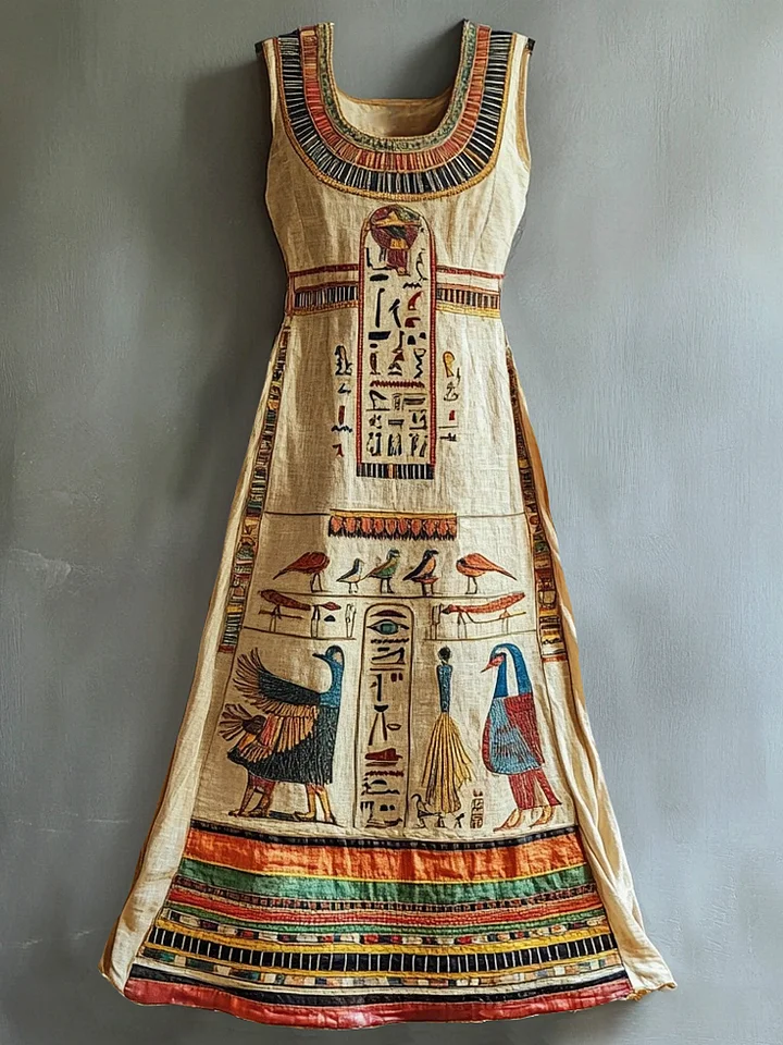 Egyptian Elements Printed Vintage Linen Women's Vest Maxi Dress