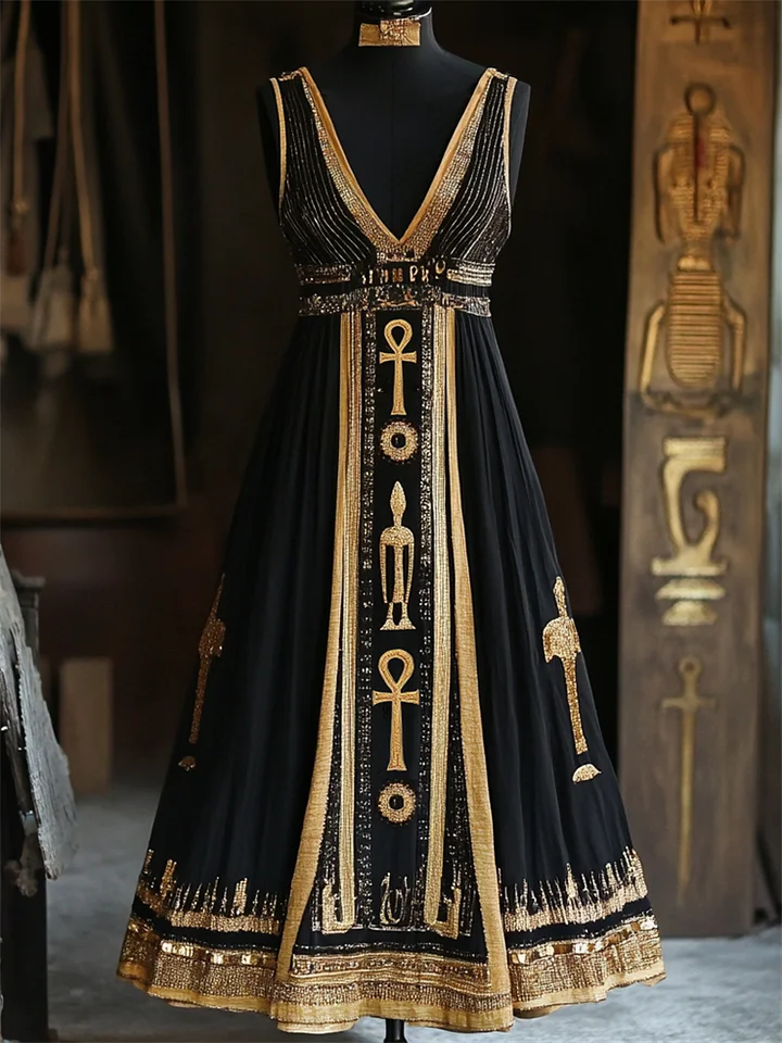 Elegant Ankh Ancient Egyptian Glitter Embroidered Linen Maxi Dress