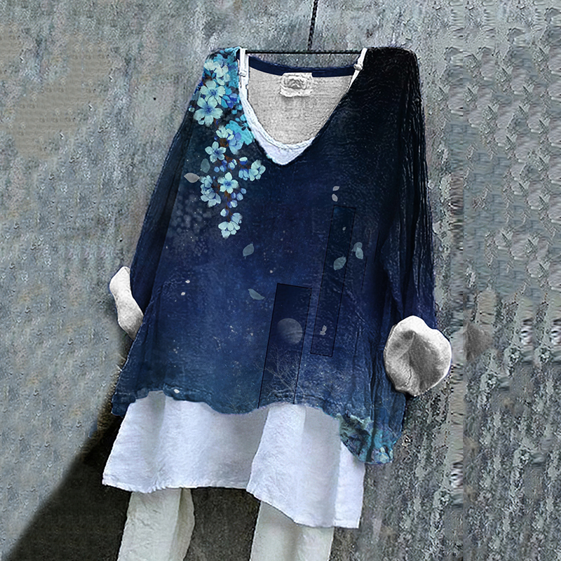 Japanese Floral Art V-neck Cotton And Linen Shirt