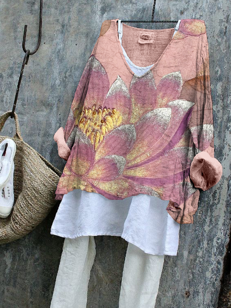Lotus Flowers Japanese Art Linen Blend Cozy Tunic