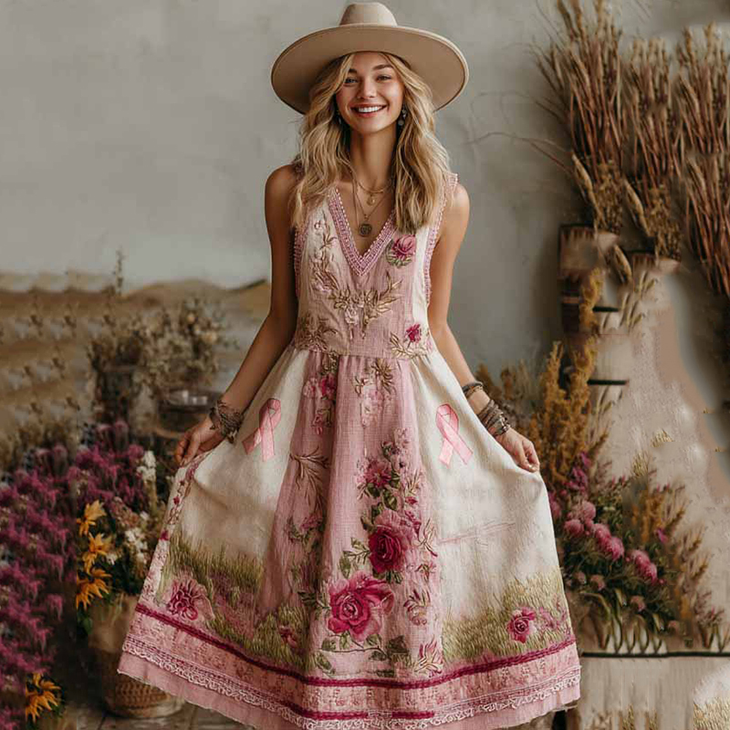 Vintage Classy Gradient Pink Roses Cancer Awareness Ribbon Embroidered Linen Maxi Dress