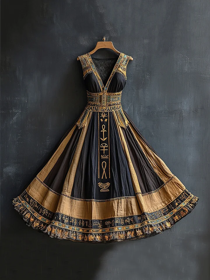 Vintage Egyptian Art Women's Linen V-neck Maxi Dress