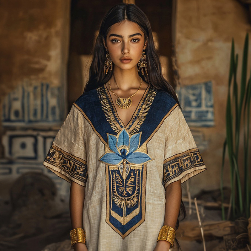 Vintage Egyptian Lotus Embroidery Three-quarter Sleeves T-shirt