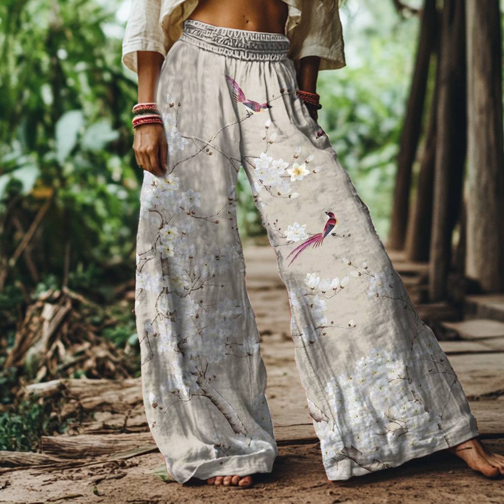 Vintage Floral and Bird Art Print Loose Wide-leg Pants