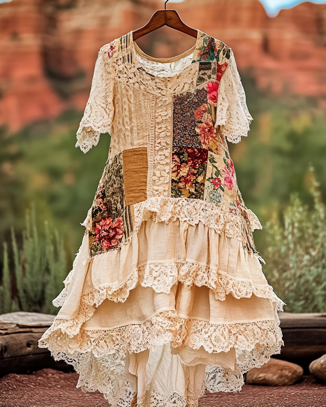 Vintage Floral Lace Patchwork Irregular Lotus Ruffle Dress 8341