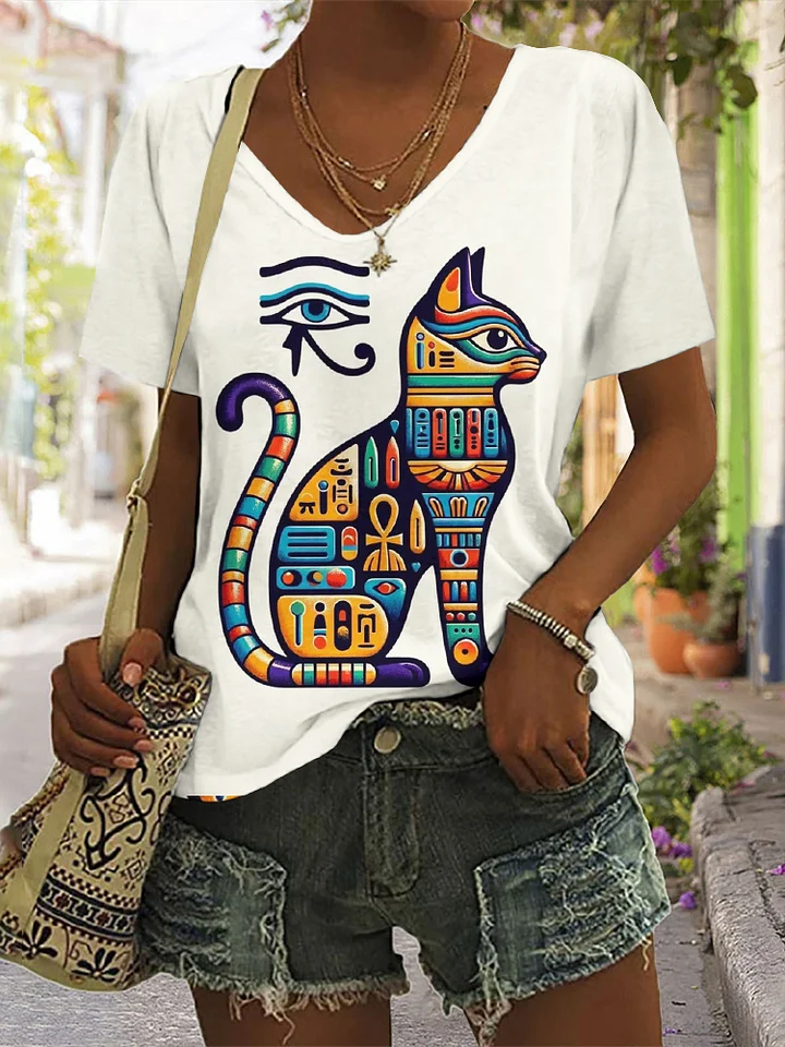 Women's Ancient Egyptian Black Cat Embroidered V-neck Short-sleeved T-shirt