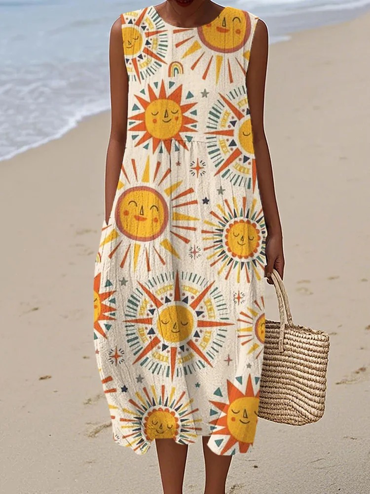 Women's Summer Solstice Art Elements Vintage Print Sleeveless Linen Pocket Wrap Dress